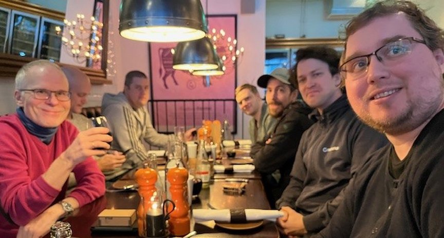 Till lunchen var även Norrbottens Byggmästareförenings seniorer och hedersmedlemmar inbjudna. Det är ett glatt gäng med många roliga och otroliga historier från hur det var förr, på den tid då de var de var aktiva i näringslivet och i föreningen.